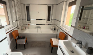 A kert végében akár fürdésre is alkalmas kerti tó terül el, de medence létesítésére is van lehetőség: a víz- és elektromos kiállások már készen állnak, a fűtéshez egy kisebb hőszivattyú kiépítésére van csak szükség.