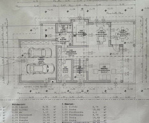 Alsószinten előtér, teraszkapcsolatos nappali, közlekedő, dolgozószoba és 44,65nm-es duplagarázs lett kialakítva.