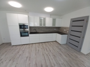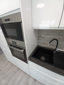 - indukciós tűzhellyel, mikróval, mosogatógéppel beépített magasfényű fehér konyhabútor gránit mosogatóval,